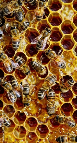 Bees gathering on honeycomb in natural environment for educational beekeeping publication