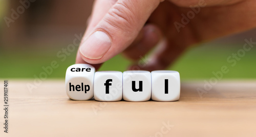 Being careful and helpful. Dice form the words "helpful" and "careful".