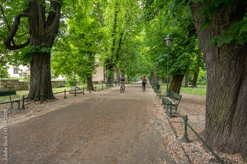 Biker and pedestrian in Planty Park in Cracow during springtime 2020