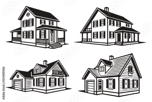 Black and white architectural illustrations of four different house styles on a white background