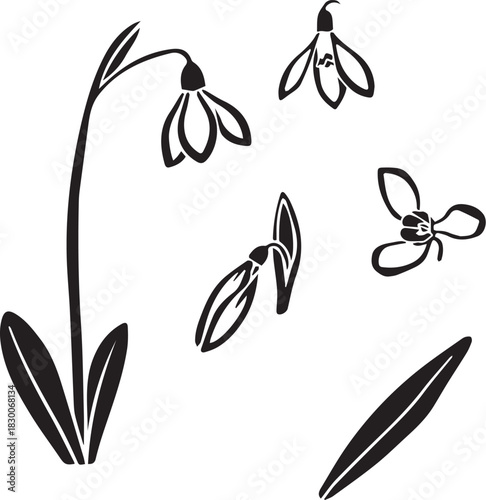 Black and White Botanical Sketch Illustration of Snowdrop Flower