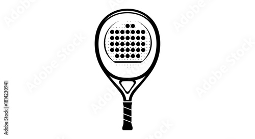 Black and white graphic illustration of a padel tennis racket with a perforated head and striped grip, used for sports.