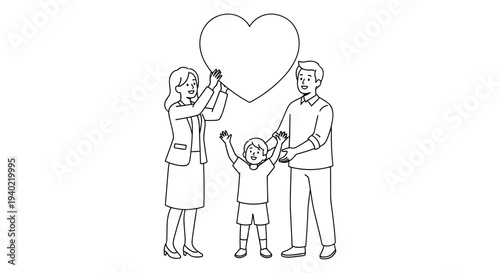 Black and white outline vector illustration of a happy family holding a large heart shape, symbolizing love, care, and unity, ideal for family-focused designs and concepts.