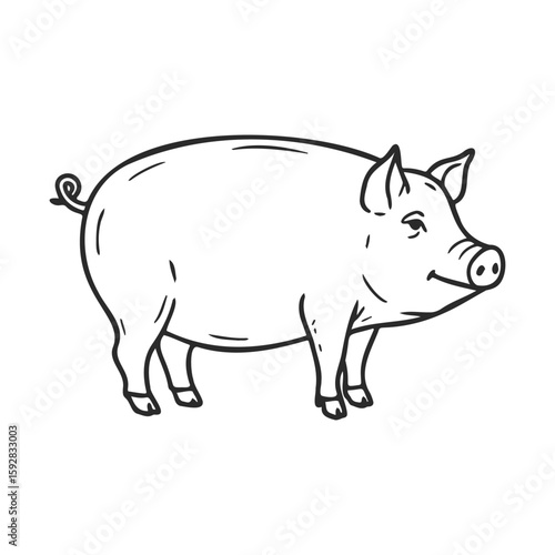Black and white pig illustration showing standing pig with twisted tail and detailed features