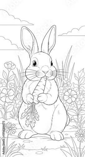 Black and White Rabbit Illustration with Flowers.