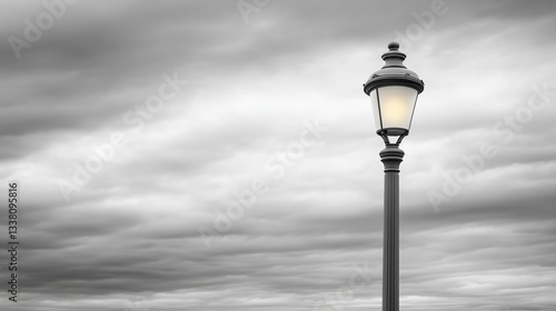 Black and white street lamp glowing under dramatic cloudy sky. Solitude and nostalgia