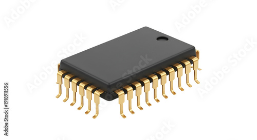 Black integrated circuit chip with gold pins on dark background