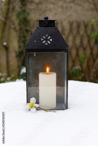 Black Lantern and candle on a snow covered table.