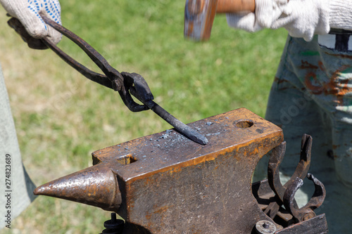 Blacksmith forges metal billet on the anvil against the background of green grass