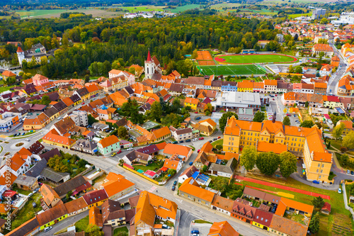 Blatna downtown with gothic Bell Tower and Water castle