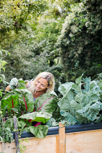 Blond woman harvesting mangold from her raised bed in her own garden