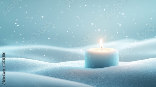 Blue candle burning in snow with winter snowfall