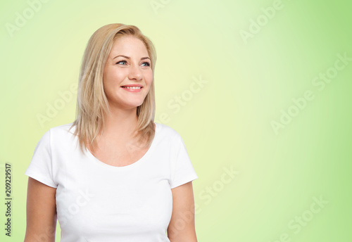 body positive and people concept - happy woman in white t-shirt over lime green natural background