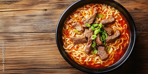 Bowl of spicy beef ramen with tender beef strips and green onions in rich broth on rustic wooden table background showcasing warm tones.