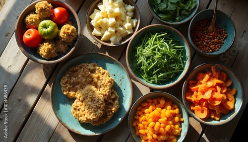 Bowls with vegetarian food on wooden table, top view. Healthy food concept