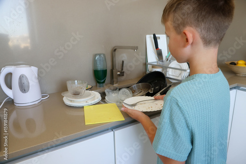Boy Holding Dirty Plates in Kitchen Near Sink