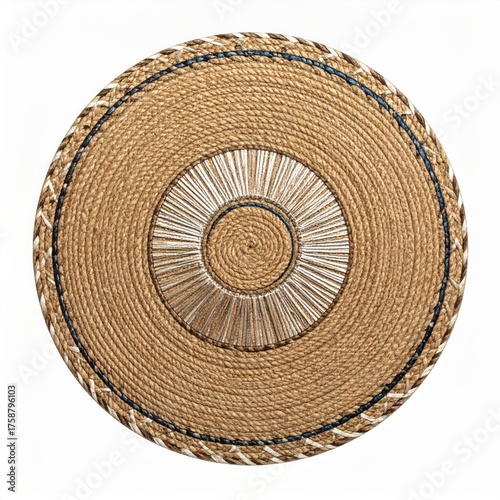 Braided Round Woven Jute Rug with Blue Stitching on White Background