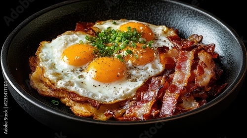 Breakfast Dish with Fried Eggs and Crispy Bacon in Black Bowl
