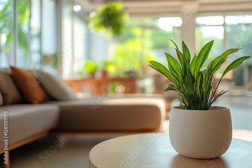 Bright interior showcases home planning with prefabricated house design concepts, featuring cozy seating area and vibrant greenery. Concept embraces modern living with efficiency and style