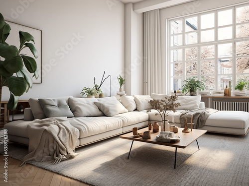 Bright white living room boasting a calm atmosphere. AI Generative.