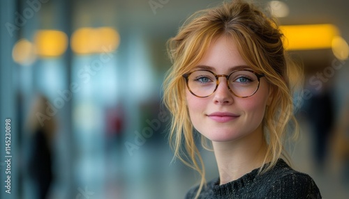Bright-eyed woman with glasses showcases a warm smile in a contemporary space
