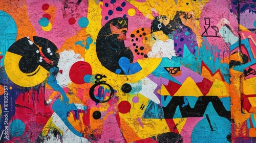Brightly colored 90s graffiti and street art on a textured wall