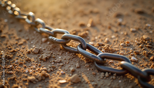 Broken chain link on dusty ground with soft sunlight highlighting edges