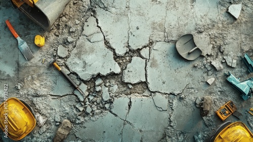 Broken concrete, scattered tools, construction debris.