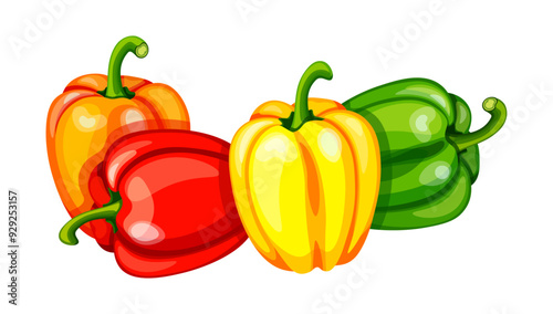Bunch of bell peppers in cartoon style. Vector illustration of fresh and delicious bell peppers in different colors: red, green, yellow, orange, isolated on white background. Group of bell peppers.