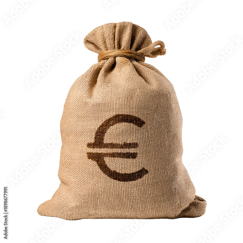 Burlap money bag with Euro symbol isolated PNG, sack of cash on transparent background, financial concept for business and economy