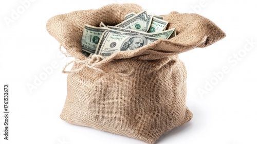 Burlap sack full of dollar bills isolated on white background symbolizing finance wealth and savings