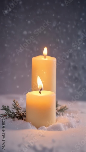 Burning candle, pristine snow, tranquil winter scene, snow, quiet, snowscape