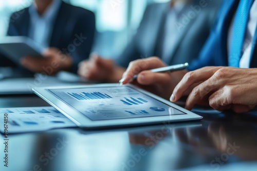 Business colleagues using a digital tablet in a boardroom, Generative AI