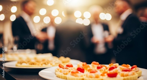 Business event with food and people blurred in the background and appetizers close up on plates