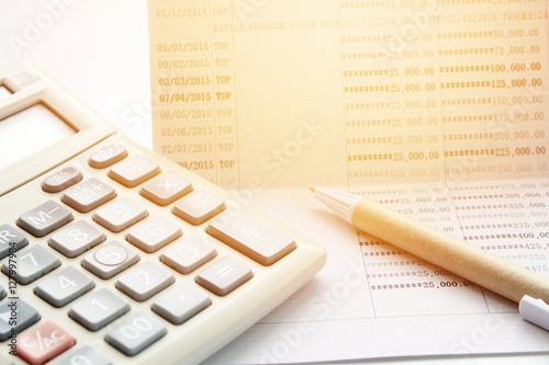 Business, finance savings or mortgage background concept ; Pen, calculator and savings account passbook on white background