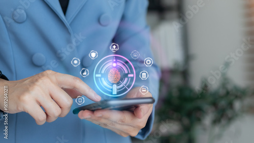 Business hand using smartphone with fingerprint biometric authentication hologram, concept of cybersecurity, secure login, digital identity, mobile banking, privacy protection, and data security.