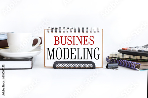 business modeling. text on white paper. near the cup