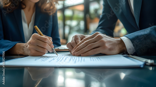 Business people reviewing and signing a contract. Focus on hands, pen and document.
