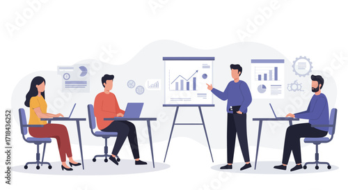 Business presentation team in training session with data charts demonstrating collaboration and corporate strategy in modern office ideal for marketing