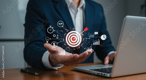 Business professional presenting success target. Executive showcasing precision and strategy. Corporate leader with analytics and innovation icons.