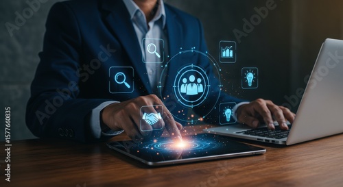 Business professional using high-tech AI interface. Futuristic corporate environment with digital icons. Teamwork and technology integration in workspace.