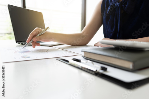 Business women is analyzing marketing strategy from the selling performance graph in the room and work from home.
