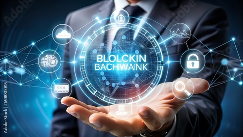 Businessman holding a blockchain technology concept with digital icons and network connections