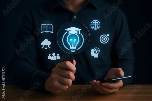 Businessman holding magnifying glass highlighting glowing graduation cap and lightbulb symbol surrounded by educational and digital learning icons on dark background