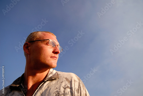 businessman in glasses looks aside