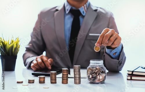 businessman with a coin in a glass Along with pressing the calculator and writing down savings for the future after retirement, ideas for saving money for the future and life after retirement