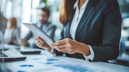 Businesswoman using a tablet to present ideas to her team, with colleagues actively participating in the discussion