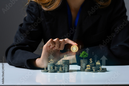 Businesswoman with stack of coins and small tree growing on coin. Saving money and investment concepts