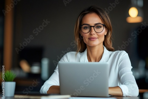 Businesswoman working on laptop in modern office setting