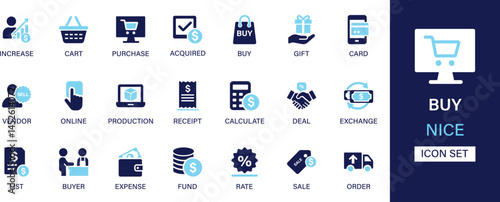 Buy icon set collection. Increase, cart, purchase, acquire, gift, card, vendor, production, receipt, deal, sale, expense and best solid icon set.